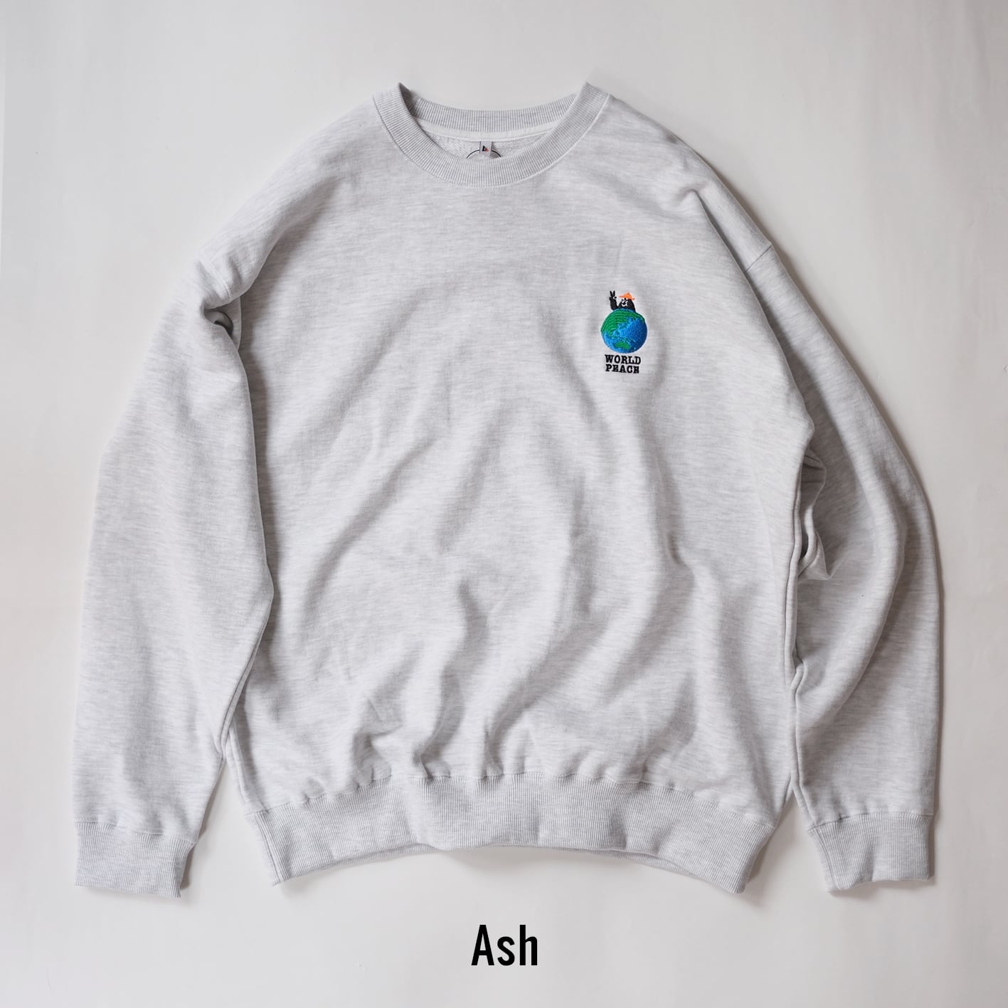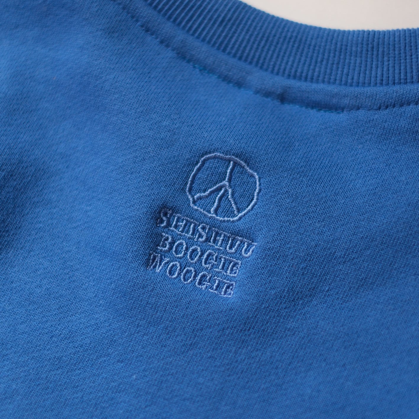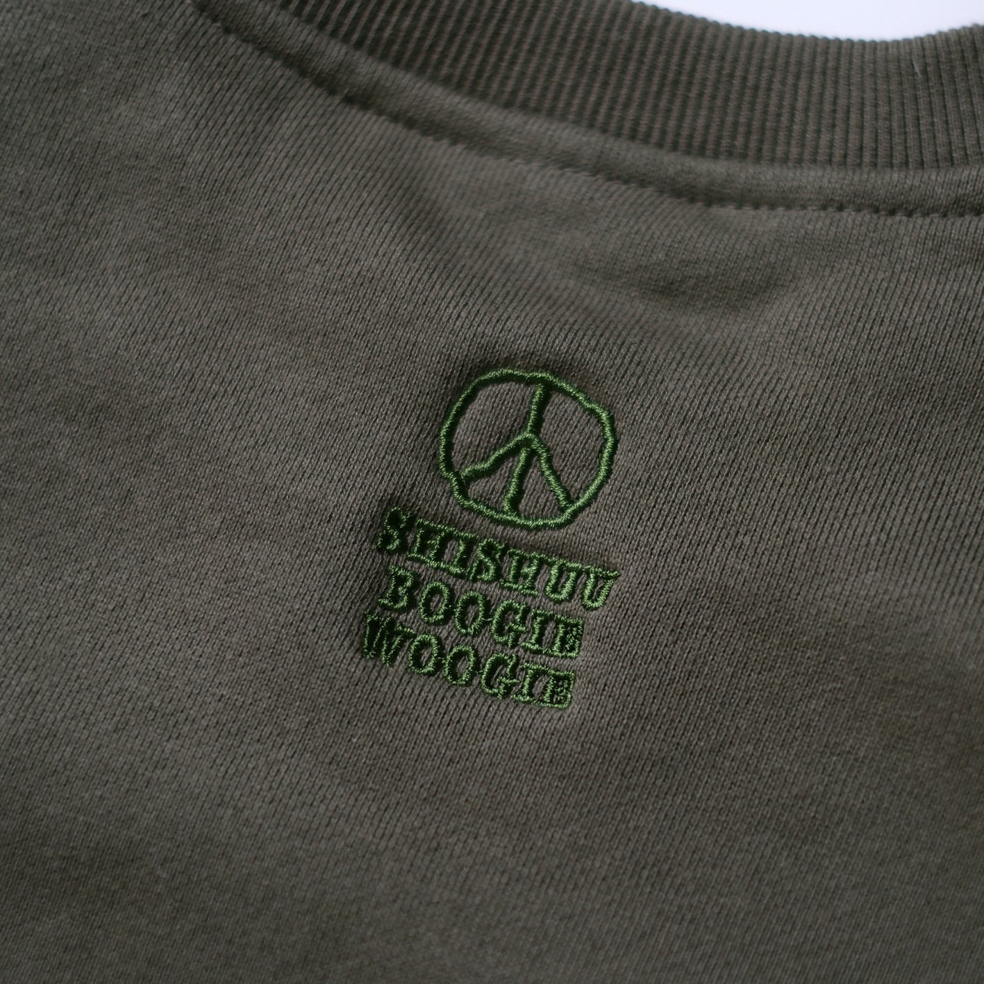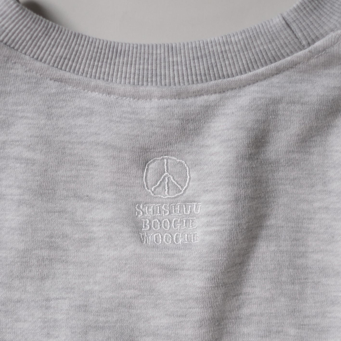 左胸には新しいグラフィックのBoogieくんが地球越しにピースサインを投げかけるまさに"World Peace"なデザインに仕上がりました。地球の刺繍はあえてリアルな表現をするためにボコボコに刺繍で表現しておりランドスケープ感が楽しめる仕様にしました。背中にも同色のブラウン糸でピースマークとShishuu Boogie Woogieの文字が刺繍してあり気分を上げてくれます。サイズも広く作ったのでユニセックスで男女共々着用出来ます。厚すぎない生地が着心地良く軽い10oz生地のパイル地を使用しているので肩の疲れを軽減し、身幅はゆったり着丈は短めでスッキリしているので結局このスウェットをいつも着ちゃいそうです。