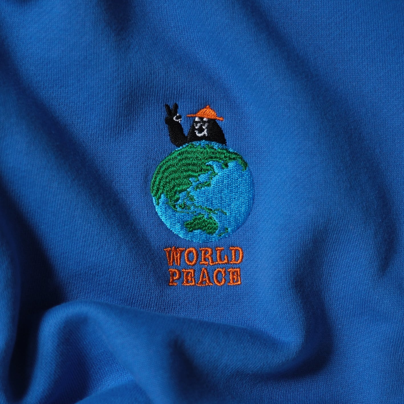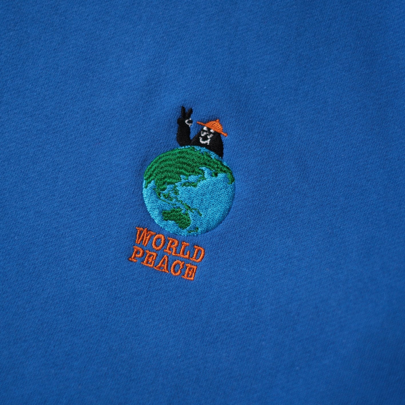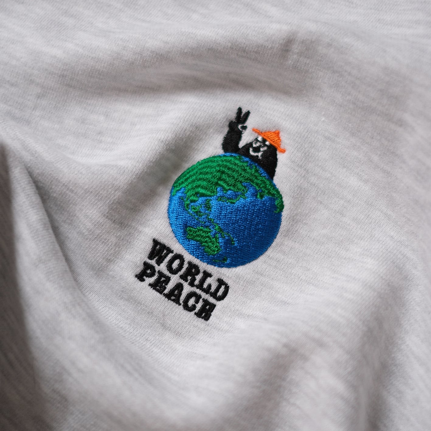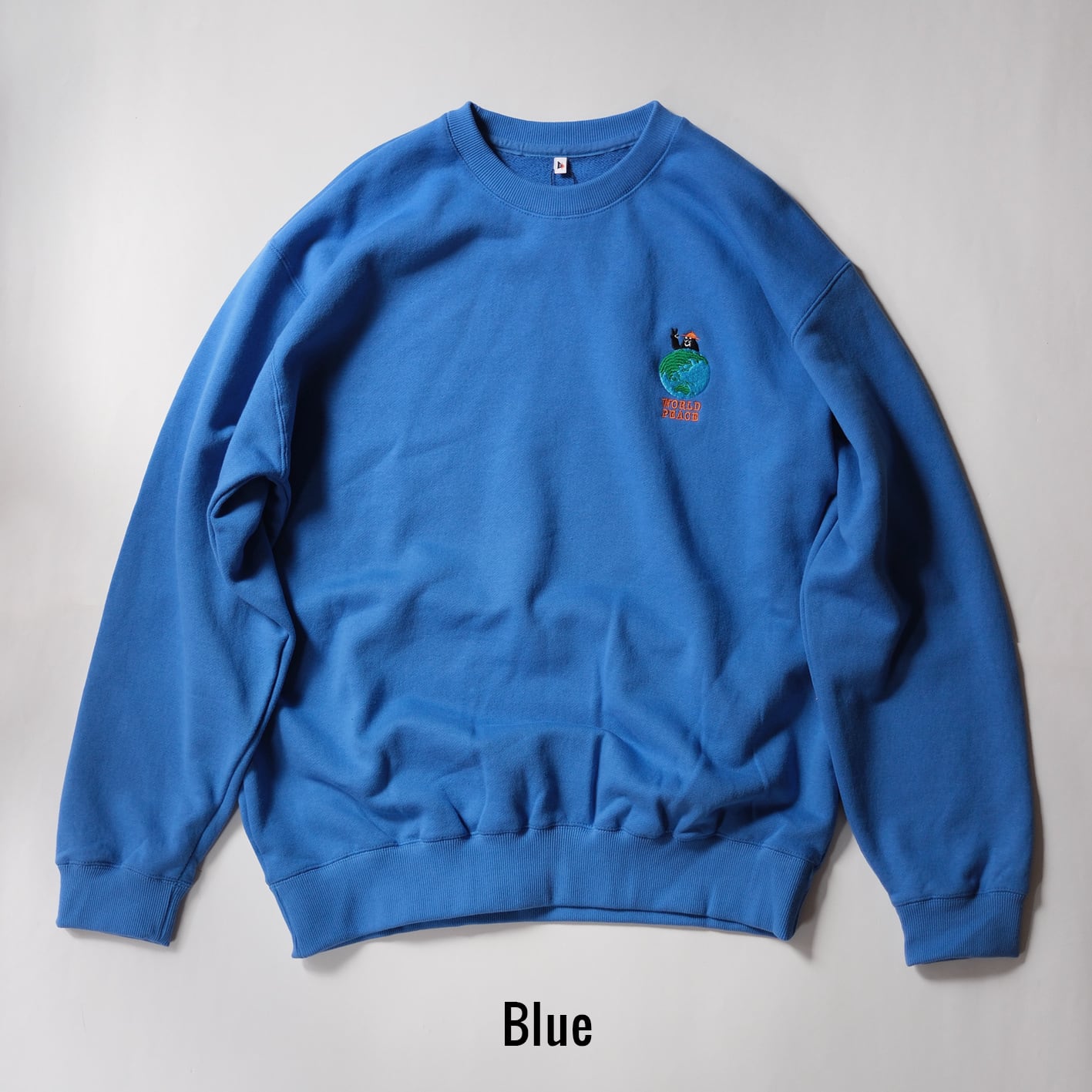 左胸には新しいグラフィックのBoogieくんが地球越しにピースサインを投げかけるまさに"World Peace"なデザインに仕上がりました。地球の刺繍はあえてリアルな表現をするためにボコボコに刺繍で表現しておりランドスケープ感が楽しめる仕様にしました。背中にも同色のブラウン糸でピースマークとShishuu Boogie Woogieの文字が刺繍してあり気分を上げてくれます。サイズも広く作ったのでユニセックスで男女共々着用出来ます。厚すぎない生地が着心地良く軽い10oz生地のパイル地を使用しているので肩の疲れを軽減し、身幅はゆったり着丈は短めでスッキリしているので結局このスウェットをいつも着ちゃいそうです。