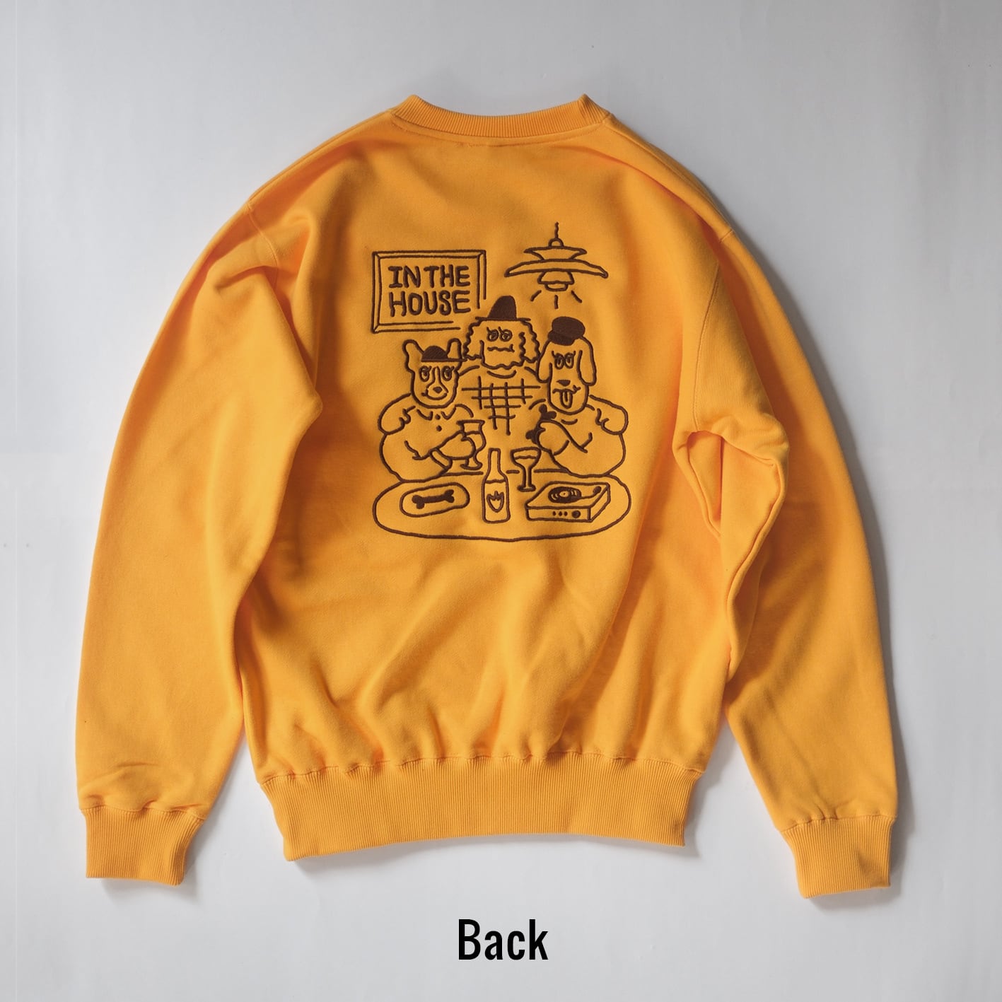 犬3兄弟がテーブルを囲み、骨をつまみにお酒を飲みながらレコードを聴く姿が心地よいグラフィックが背中に大きく入っている刺繍でかなり贅沢に仕上げました。