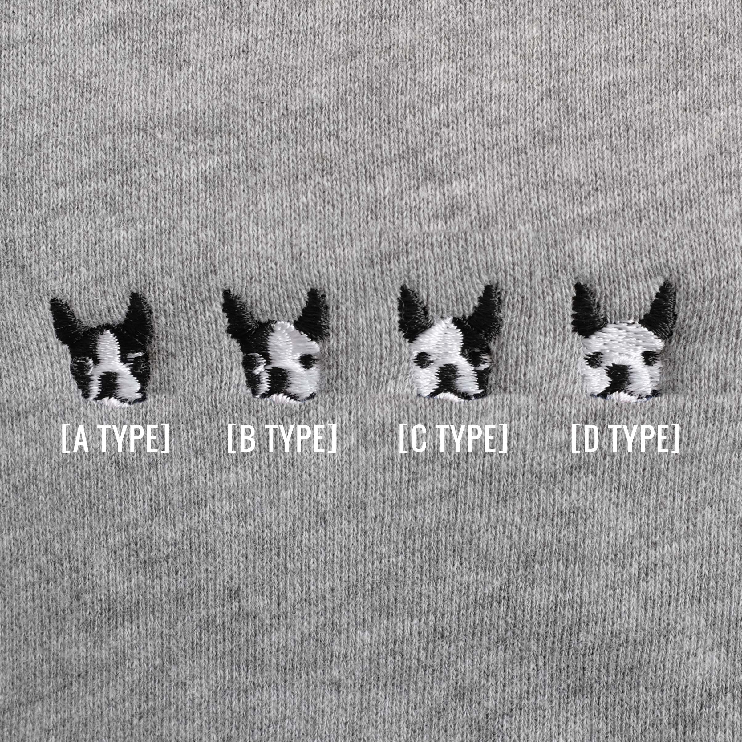 B=右側が黒い顔の右片パンチ柄のボストンテリア